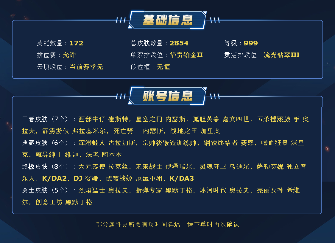 ~~喜欢记得收藏~~可排位~~2813皮全英雄丨1243原皮1528炫彩丨90神话/至臻/海克斯丨鼠年套丨虎年套丨电玩套丨女帝套丨EDG套丨FPX套丨KDA套丨DGW套丨情人节套丨海之歌套丨灵魂莲华套丨神龙尊者套丨破败军团套丨福牛守护者套丨斩星剑圣丨穿星赵信丨玉剑男女刀~~租之前尽量查一下游戏ID,确保段位是您需要的,避免浪费您的时间~~请勿挂机逃跑故意送人头,谢谢合作,谢谢~~