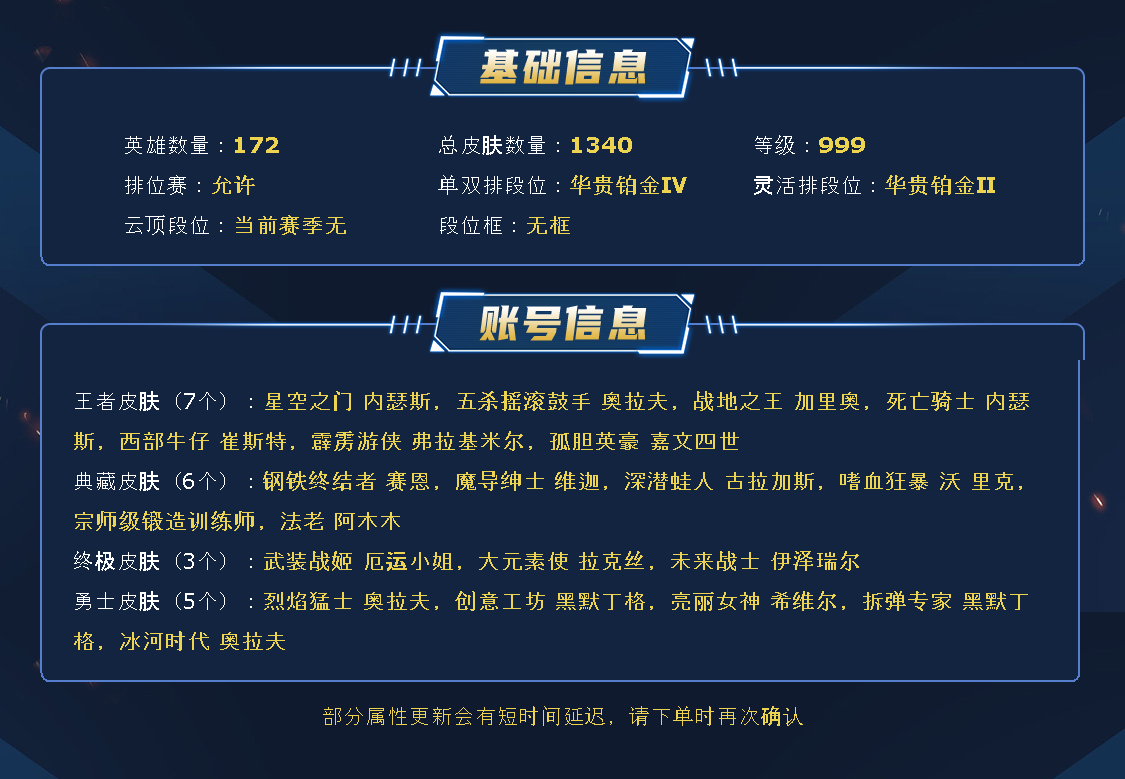 ~~喜欢记得收藏~~可排位~~1300皮全英雄丨70神话/至臻/海克斯丨龙瞎/龙的传人丨IG套丨神龙尊者套丨灵魂莲华套丨FPX套丨KDA套丨斩星剑圣丨创星璐璐丨卧虎藏龙丨嫦娥皎月丨舞会公主丨星守风女丨电玩瑞文丨替父从军丨羊年金克斯丨甜心霞洛琴女丨玉剑男刀剑姬丨泳池女警佐伊~~租之前尽量查一下游戏ID,确保段位是您需要的,避免浪费您的时间~~请勿挂机逃跑故意送人头,谢谢合作,谢谢~~