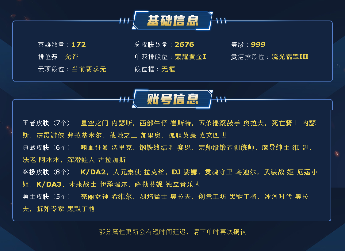 ~~喜欢记得收藏~~可排位~~2600皮全英雄丨1401原皮1138炫彩丨120神话/至臻/海克斯丨IG套丨灵魂莲华套丨神龙尊者套丨福牛守护者套丨幻灵套丨鼠年套丨DRX套丨虎年套丨女帝套丨执事套丨电玩套丨KDA套丨DWG套丨青花瓷套丨至高天套丨情人节套丨太空律动套丨破败军团套丨光明哨兵套丨咖啡甜心套丨水晶玫瑰套丨幽梦玫瑰套丨星之守护者套丨冰原酒桶丨斩星剑圣丨穿星赵信丨玉剑男女刀~~租之前尽量查一下游戏ID,确保段位是您需要的,避免浪费您的时间~~请勿挂机逃跑故意送人头,谢谢合作,谢谢~~