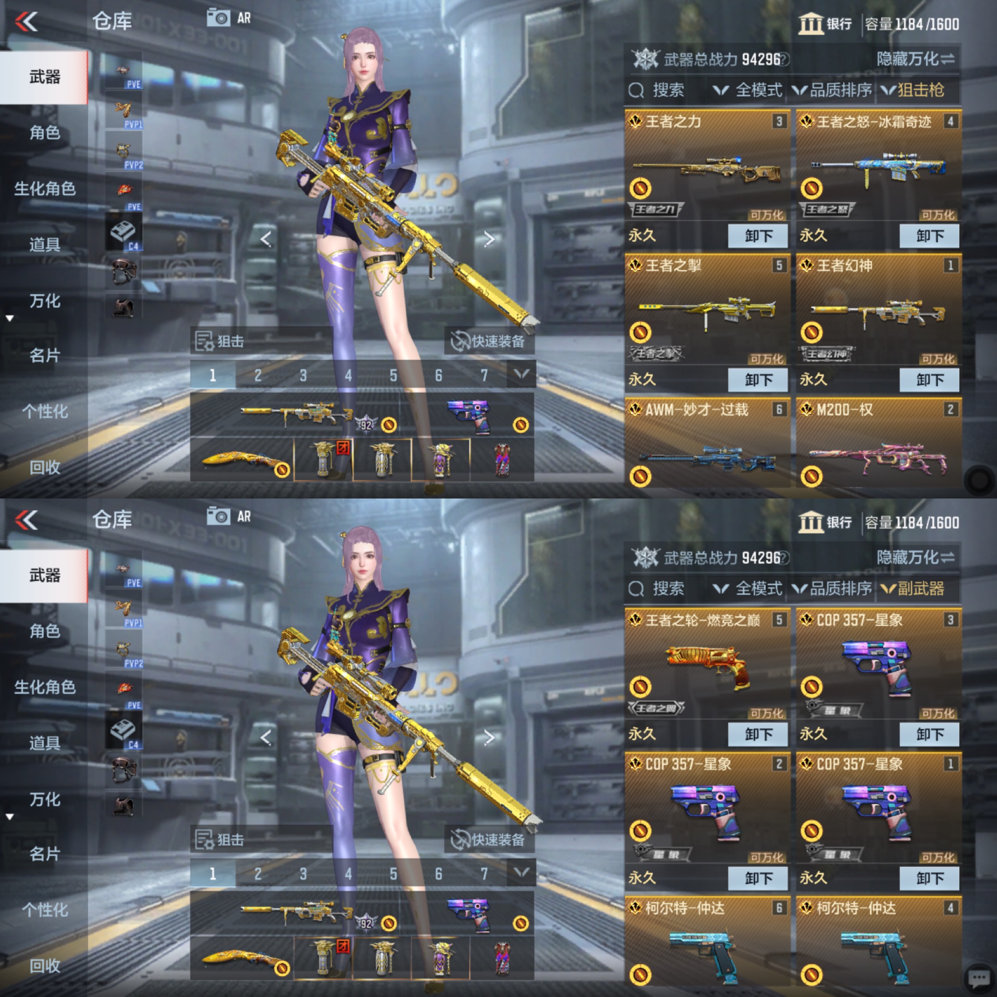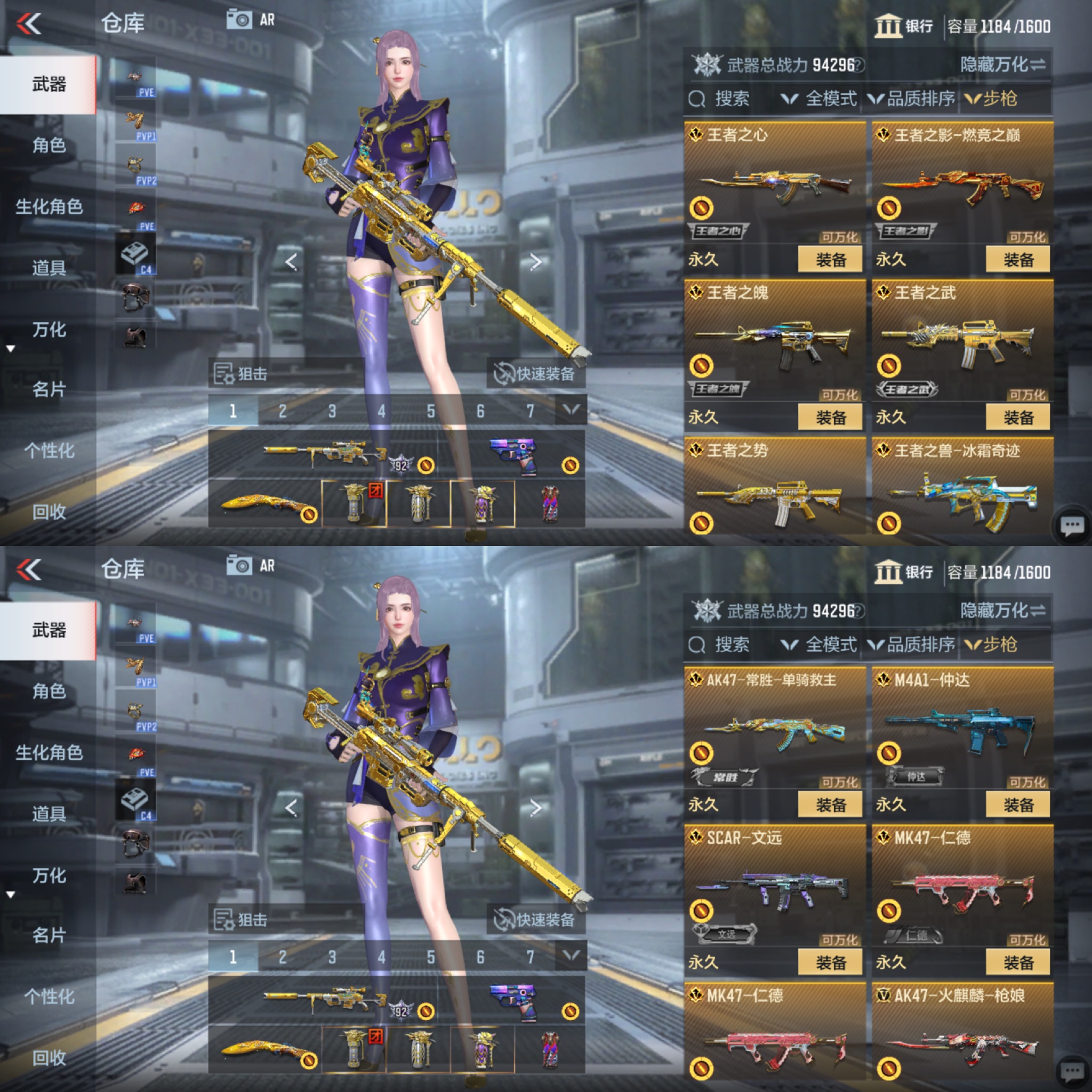 🔥主武器:王者之尊✨王者81✨王者之势冰霜奇迹(王势)✨王者之影燃竞之巅✨王者之兽✨王者之武✨王者之魄王者之心✨M4AA1仲达+音效卡✨VEPR12本初✨文远✨AK47冰魂✨M4A1运输船✨M4A1卧龙✨M4A1死神✨寒霜烈龙✨MK5极光✨CZSZ心动次元觉醒✨AN94超新星✨SCAR幽暗骑士✨M4A1堕天神✨M4A1竞界荣光✨81阿波罗✨M4A1游骑兵
