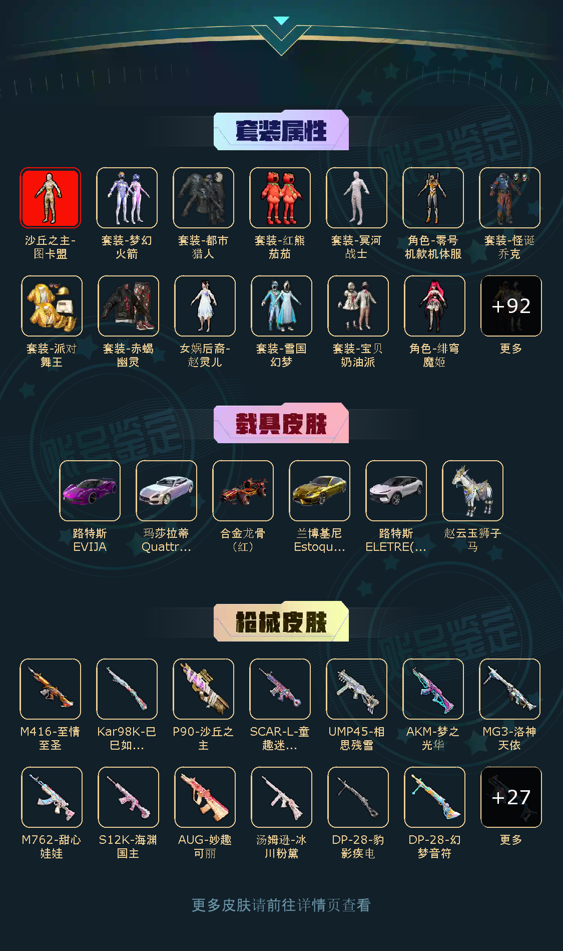 100粉,6载具,40特效枪,386套装,14王牌印记 SCAR-L-梦幻火箭/SCAR-L-童趣迷兔/SKS-碧影闪光/M416-风花雪月/AUG-星之彼岸/M762-甜心娃娃/Vector-红伞翩翩/GROZA-香水柠檬/AWM-橘柚倾心/M416-心之恋语/平底锅-林间仙鹿/M24-暗星紫秘/DP-28-幻梦音符/Mini14-绚金瑰梦/MG3-洛神天依/SCAR-L-青春物语/SLR-暗夜玫瑰/S12K-海渊国主/UMP45-相思残雪/UMP45-恐龙拽拽/M249-蓝莓炮弹/野牛-流星咚咚/AKM-梦之光华/Kar98K-绿意幻情/兰博基尼Estoque(炫光金)/路特斯ELETRE(花绽灰)/合金龙骨(红)