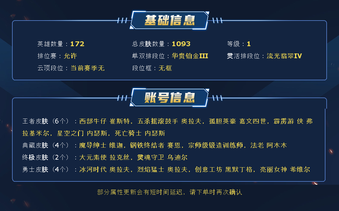 ~~喜欢记得收藏~~可排位~~1053皮全英雄~~租之前尽量查一下游戏ID,确保段位是您需要的,避免浪费您的时间~~请勿挂机逃跑故意送人头,谢谢合作,谢谢~~