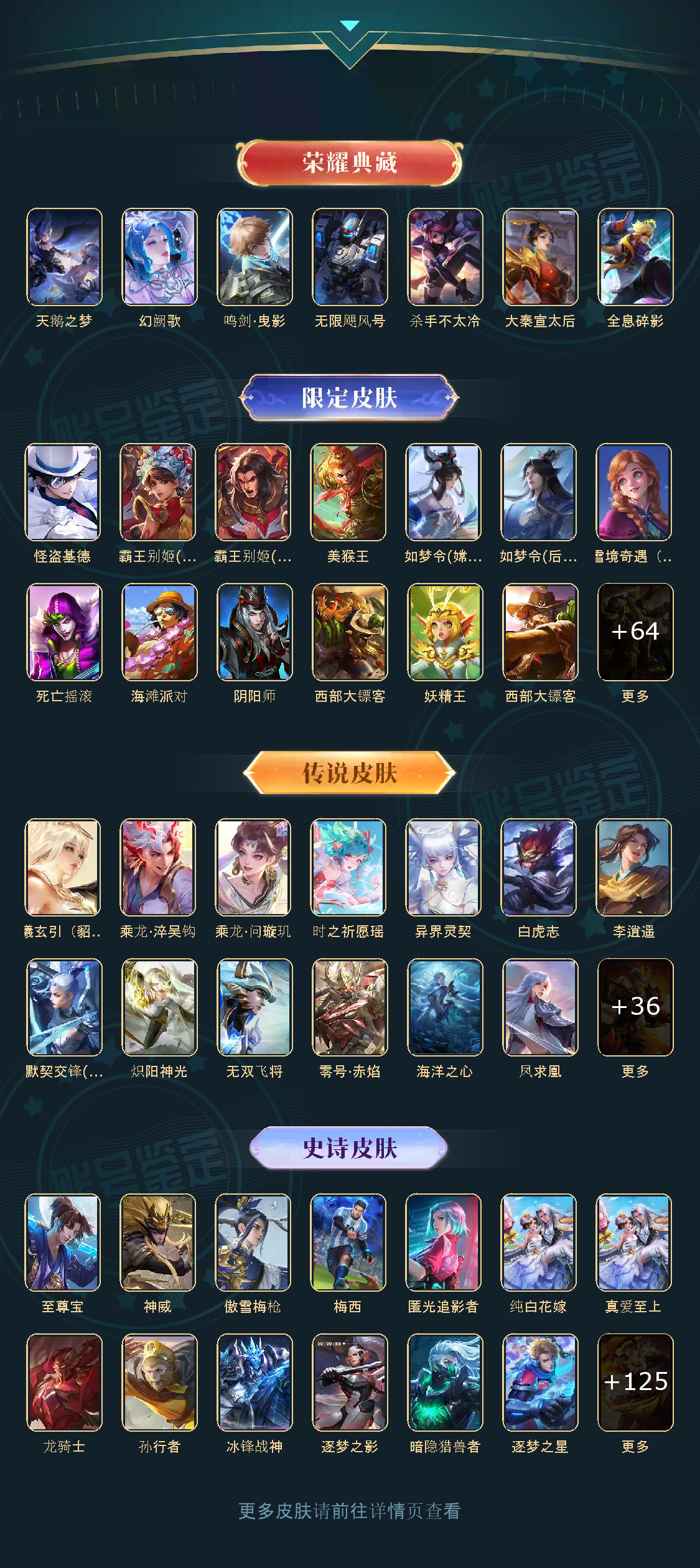 贵族等级V10,英雄数量124,典藏皮肤数6,皮肤数量434,