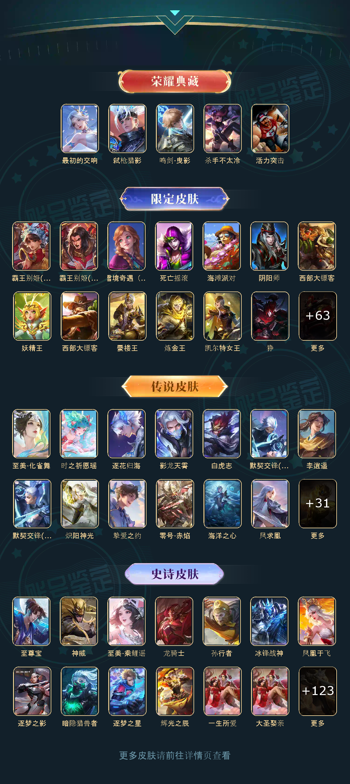 贵族等级V10,英雄数量126,典藏皮肤数4,皮肤数量435,冰锋战神街头霸王至尊宝杀手不太冷王者之锤凤求凰逐梦之影神奇女侠黄金狮子座一生所爱大圣娶亲白虎志朱雀志活力突击梁祝鸣剑·曳影龙胆李逍遥武圣奔雷神使孙行者神威淬星耀世时雨天司