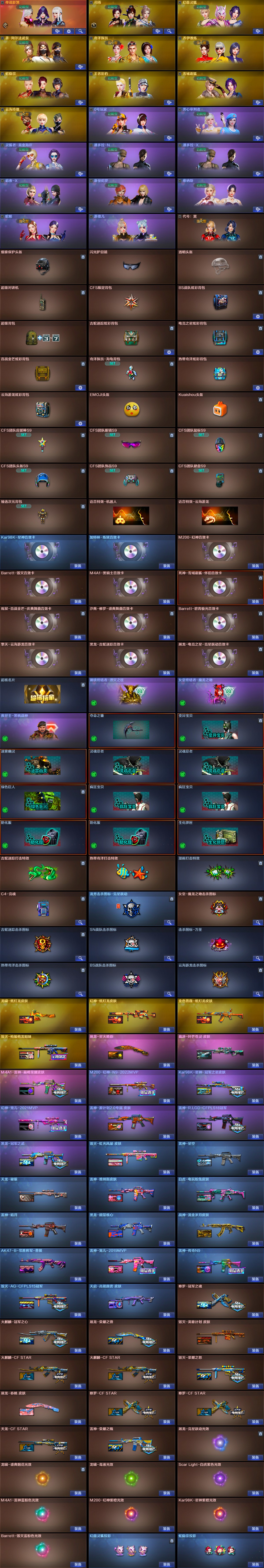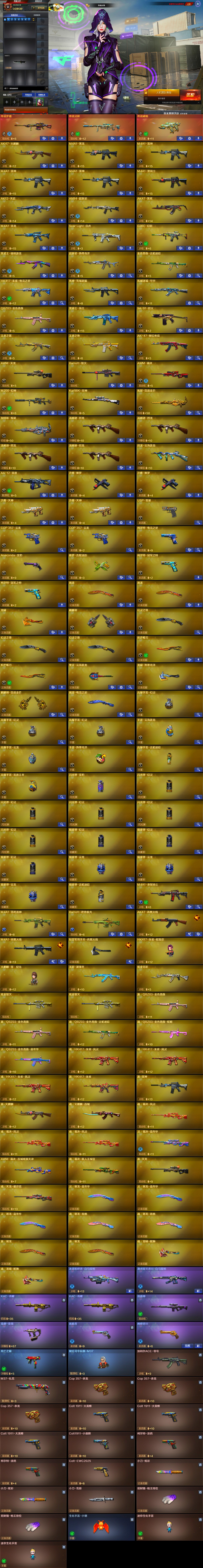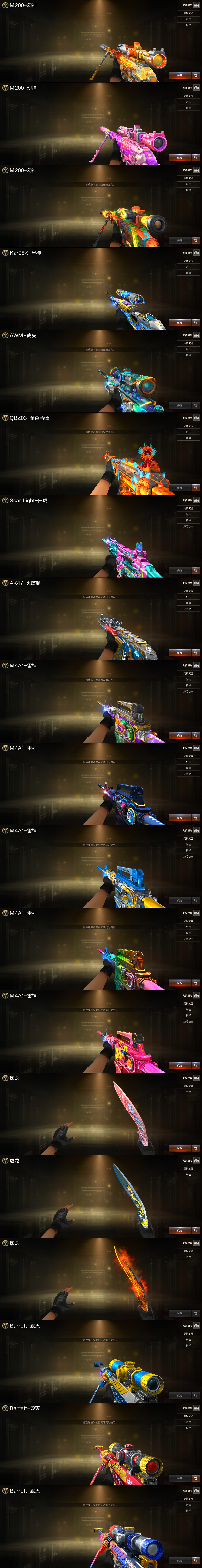 【稀有武器】:传说梦魇/传说灵眸/传说破晓/M200-幻神/Kar98K-星神/G36C-幻影/ScarLight-白虎/M4A1-青龙/USP-雷暴/COP357-云龙(2)/修罗-古蛇迷踪/柯尔特-冠军之特(2)/金色蔷薇-古蛇迷踪/QBZ03-金色蔷薇/AK47-火麒麟/M4A1-黑龙/M4A1-雷神(3)/M4A1-黑骑士/Barrett-毁灭/AWM-裁决/加特林-炼狱/汤姆逊-烈龙(4)/AA-12-雷霆/炽芒蝶刃(2)/幻灵之锋(3)