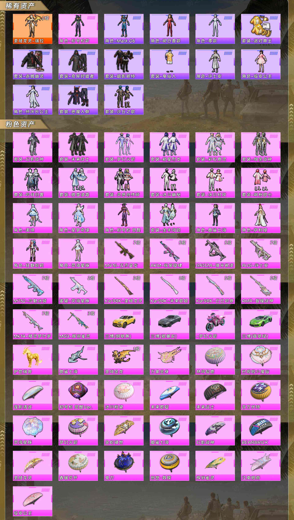 【粉色枪皮】M416-五爪金龙/AKM-炫紫旋律/GROZA-镜光银凌/AUG-许七安/M762-冷魅冰骑/蜜獾-荧海星豚/Kar98K-圣域龙灵/Kar98K-未来歌姬/Kar98K-巳巳如意/AMR-智耀战神/Mk14-精灵梦叶罗丽/MG3-辉羽雀灵