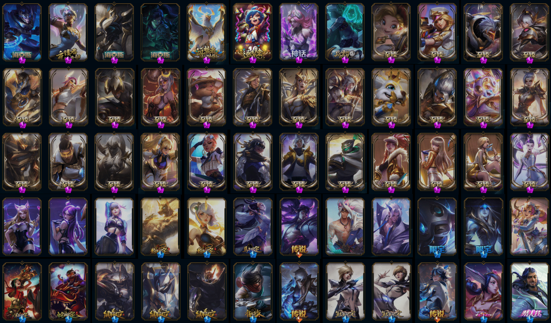 【传说皮肤】合金巨兽努努和威朗普 钢铁军团盖伦 钢铁之翼凯尔 第三类接触黑默丁格 天煞劫 未来战士凯特琳 恶魔之刃泰达米尔 星之守护者阿卡丽 青花瓷伊泽瑞尔 神龙尊者夜月幻龙亚索 黑夜使者亚索 暗星锤石 提莫约德尔人的一大步 冰霜之刃艾瑞莉娅 上古战魂魔腾 魔幻卡牌崔斯特 地狱行者孙悟空 欧米伽小队幽灵特工 神龙尊者圣龙李青 灌篮高手德莱厄斯 灵魂莲华锤石 霸天异形卡兹克 战斗学院伊泽瑞尔 女校长菲奥娜 战场女武神凯尔 宇航员诺提勒斯 腥红之月鬼武姬阿卡丽 焰尾妖狐阿狸 冰霜亚龙希瓦娜 苍穹之光韦鲁斯 偶像歌手阿狸 银河魔装机神兰博 绅士科加斯 符文战熊沃利贝尔 蔷薇绅士杰斯 地狱之门卫士加里奥 律政大亨蒙多 死亡骑士盖伦 大天使长米迦勒凯尔 战地巨兽科加斯 源计划林易 金牌主播德莱文 铁哥们儿奥拉夫 真实伤害艾克 约德尔国队长提莫 源计划联合艾希 源计划净化薇恩 黯晶凤凰艾尼维亚 红色男爵库奇 烈焰雄心崔丝塔娜 陆地王者4WD布里茨 泳池派对吉格斯 双重冰晶艾尼维亚 屠龙勇士潘森 最终BOSS维迦 黯黑魔龙希瓦娜 女皇艾希