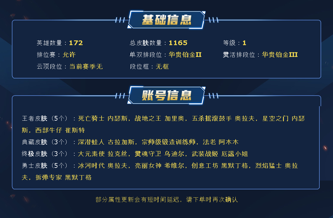 ~~喜欢记得收藏~~可排位~~1143皮全英雄~~租之前尽量查一下游戏ID,确保段位是您需要的,避免浪费您的时间~~请勿挂机逃跑故意送人头,谢谢合作,谢谢~~