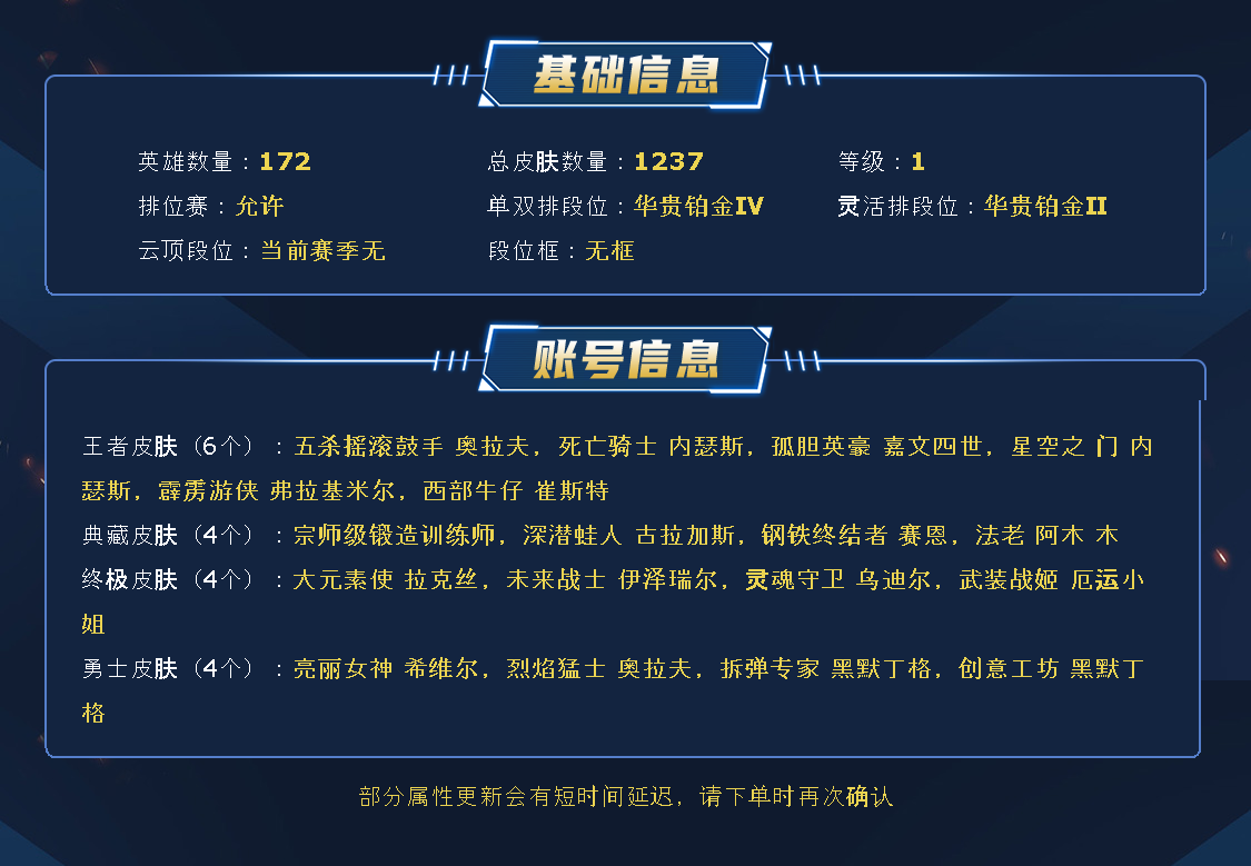 ~~喜欢记得收藏~~可排位~~1219皮全英雄丨909原皮310炫彩~~租之前尽量查一下游戏ID,确保段位是您需要的,避免浪费您的时间~~请勿挂机逃跑故意送人头,谢谢合作,谢谢~~
