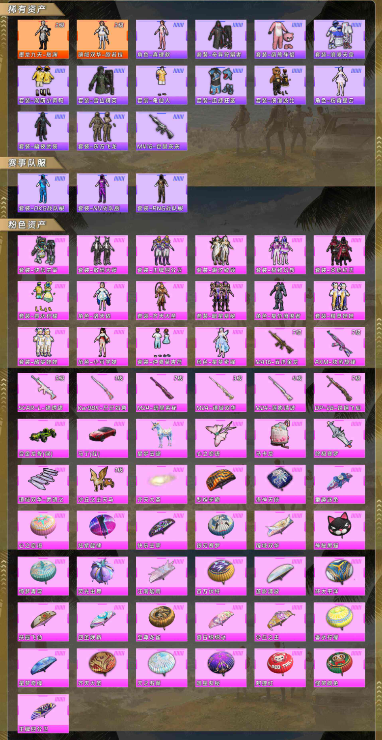 【稀有资产】墨龙九天-敖渊[2级]/镜域双华-欧若拉[3级]/角色-真理款战斗服/套装-奇异狩猎者/套装-萌熊伴侣/套装-浪漫天命/套装-潮萌小黄鸭/套装-雪山精英/套装-龟仙人/套装-迅捷狂鲨/套装-浪漫波比/角色-粉雾星云/套装-暗夜武装/套装-东方飞龙/M416-仓鼠灰灰