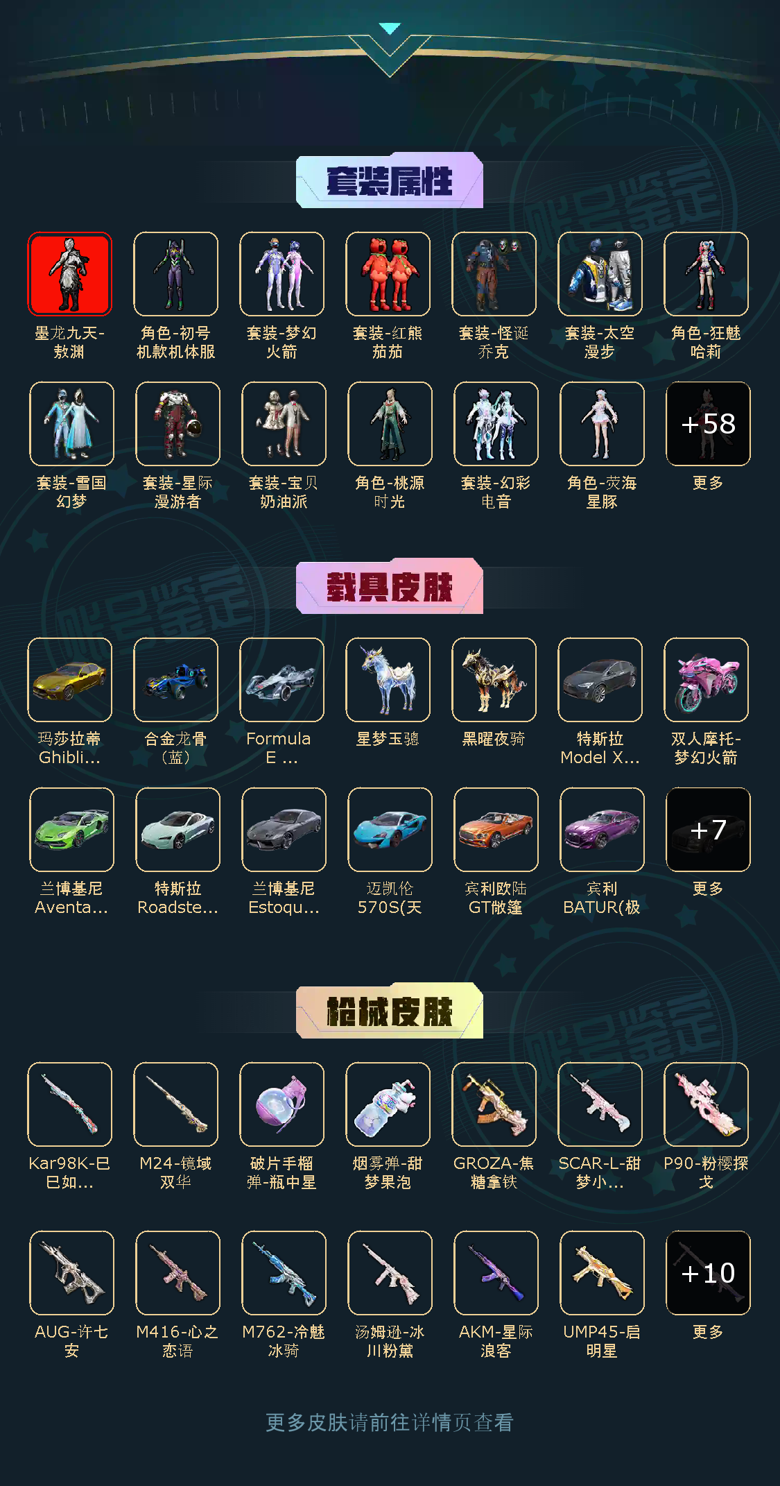 68粉,20载具,431套装,18王牌印记,卓越王牌14星历史最高段,218042热力值 平底锅-林间仙鹿/Vector-绯穹魔姬/镰刀-幽影之判/SCAR-L-甜梦小狐/AUG-南国舞曲/M416-心之恋语/M416-五爪金龙/GROZA-焦糖拿铁/M762-冷魅冰骑/AUG-许七安/AKM-星际浪客/蜜獾-辉耀战甲/SPAS-12-蜜语绒猫/Mk14-闲梦青缨/MG3-梦幻舞会/DP-28-豹影疾电/AKS-74U-信仰神谕/P90-粉樱探戈/汤姆逊-冰川粉黛/UMP45-启明星/破片手榴弹-瓶中星球/烟雾弹-甜梦果泡/Kar98K-巳巳如意/M24-镜域双华/M24-星之信仰/玛莎拉蒂Ghibli(金)/宝马M4(圣保罗黄)/兰博基尼Estoque(银翼灰)/特斯拉Roadster(水滴蓝)/宾利飞驰(布罗德盖棕双色)/宾利欧陆GT敞篷(火焰橘)/越野奶龙龙/宝马X6 M(曼岛绿)/特斯拉Model X(冷光银)/合金龙骨(蓝)/Formula E Gen2(巅峰兰)/兰博基尼Aventador(翡翠绿)/时空跃影(星辉银)/宾利BATUR(极速紫)/迈凯伦570S(天际蓝)/布加迪威龙(海洋蓝)/冰绡玉鳞/星梦玉骢/黑曜夜骑/双人摩托-梦幻火箭/