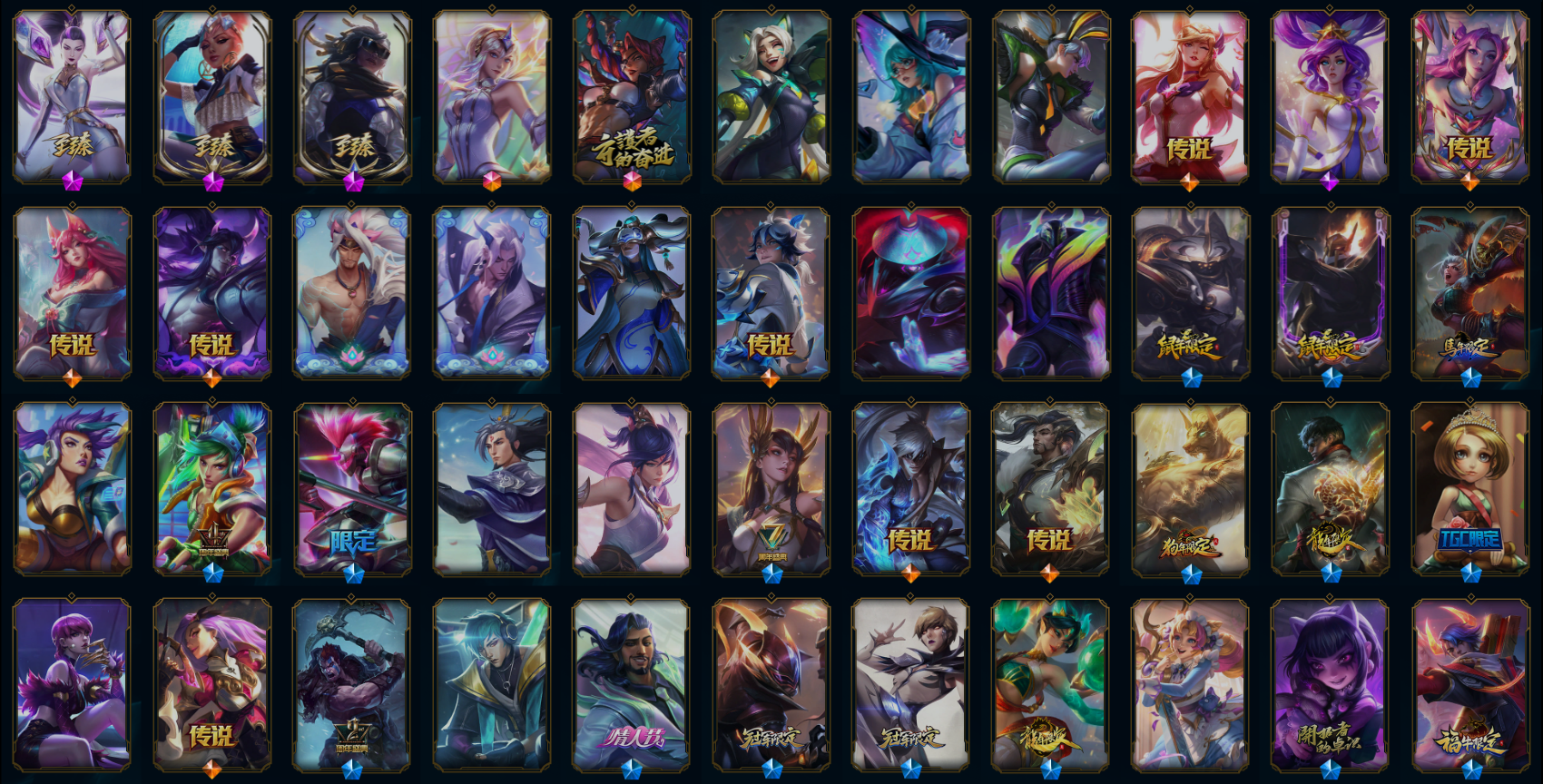 【传说皮肤】狼神英灵安蓓萨 盒子猫萨科 苹果机器人布里茨 灵能特工娑娜 冰川巨兽墨菲特 至高天派克 海魔至尊亚托克斯 恶魔之刃泰达米尔 青花瓷奥瑞利安索尔 女主播迦娜 青花瓷伊泽瑞尔 影执事劫 墨之影武者易 死亡骑士盖伦 战地巨兽科加斯 冰霜亚龙希瓦娜 西部魔影大小姐蕾欧娜 鬼魂新娘莫甘娜 星之守护者卡莎 驯龙炮手崔丝塔娜 星之守护者拉克丝 光明哨兵格雷福斯 黎明使者索拉卡 女帝卡特琳娜 神王德莱厄斯 源计划超体莫德凯撒 红色男爵库奇 源计划泯灭雷克顿 约德尔国队长提莫 炼狱魔犬内瑟斯 太空律动猫猫布里和里茨 泳池派对吉格斯 神龙尊者昼日真龙亚索 黎明使者永恩 战斗学院凯特琳 神王盖伦 战斗学院伊泽瑞尔 魔幻卡牌崔斯特 苍穹之光韦鲁斯 银河魔装机神兰博 黯晶凤凰艾尼维亚 月蚀骑士蕾欧娜 至尊魔女莫甘娜 灵魂莲华阿狸 合金巨兽努努和威朗普 星之守护者洛 屠龙勇士潘森 驯龙学者黑默丁格 神龙尊者圣龙李青 女警狙击凯特琳 灵魂莲华锤石 第三类接触黑默丁格 枯萎之壤泽拉斯 源计划毁灭派克 邪鸦魅影乐芙兰 星之守护者阿狸 提莫约德尔人的一大步 双重冰晶艾尼维亚 宇航员诺提勒斯 西部天使艾希 冰霜之刃艾瑞莉娅 真实伤害艾克 大天使长米迦勒凯尔 恶魔男爵瑞兹 战场女武神凯尔 暗星尊烬 源计划净化薇恩 天煞劫 上古战魂魔腾 钢铁之翼凯尔 陆地王者4WD布里茨 女皇艾希 日蚀骑士蕾欧娜 奥德赛凯隐 西部魔影卢锡安 律政大亨蒙多 偶像歌手阿狸 黑夜使者亚索 星之守护者金克丝 焰尾妖狐阿狸 丧尸布兰德 黎明使者锐雯 战地机甲厄加特 女校长菲奥娜 暗星锤石 地狱行者孙悟空 最终BOSS维迦 地狱之门卫士加里奥 未来战士凯特琳 源计划联合艾希 血石领主弗拉基米尔 腥红之月鬼武姬阿卡丽 绅士科加斯 神拳李青 电玩女神娑娜 黯黑魔龙希瓦娜 钢铁军团盖伦 灌篮高手德莱厄斯 霸天零式赛恩 霸天异形卡兹克 欧米伽小队幽灵特工 源计划林易 烈焰雄心崔丝塔娜 金牌主播德莱文