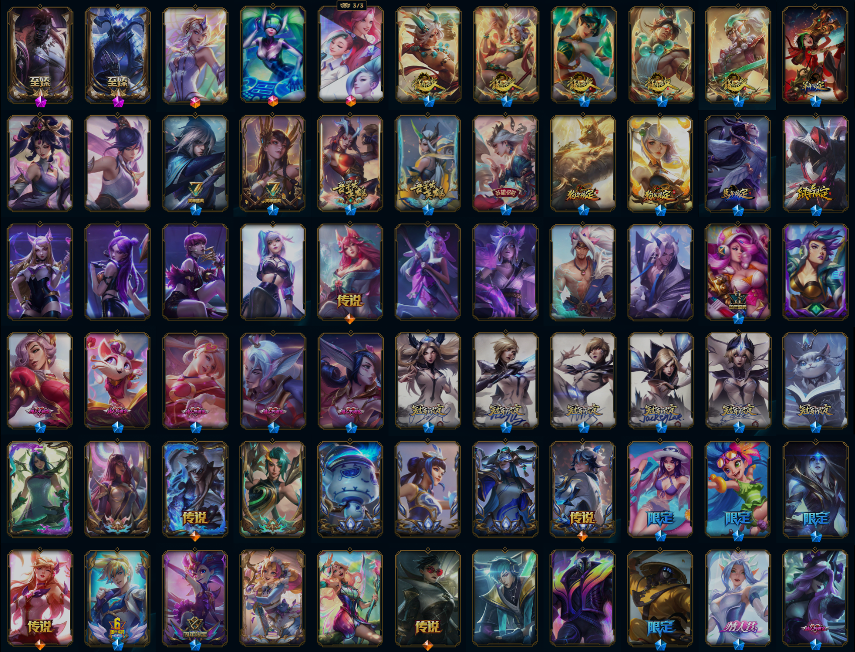 【传说皮肤】霸天零式赛恩 光明哨兵薇恩 魔女娜美 欧米伽小队幽灵特工 灌篮高手德莱厄斯 焰尾妖狐阿狸 战场女武神凯尔 地狱行者孙悟空 最终BOSS维迦 花仙女王卡尔玛 源计划林易 暗星锤石 腥红之月鬼武姬阿卡丽 黯黑魔龙希瓦娜 钢铁之翼凯尔 魔幻卡牌崔斯特 蔷薇绅士杰斯 战斗学院凯特琳 暗星女王拉克丝 女皇艾希 西部天使赛娜 星之守护者洛 恶魔男爵瑞兹 绅士科加斯 星之守护者金克丝 提莫约德尔人的一大步 女警狙击凯特琳 星之守护者霞 青花瓷伊泽瑞尔 冰霜亚龙希瓦娜 宇航员诺提勒斯 灵魂莲华阿狸 冰川巨兽墨菲特 驯龙学者黑默丁格 冰霜之刃艾瑞莉娅 黎明使者索拉卡 苍穹之光韦鲁斯 未来战士凯特琳 双重冰晶艾尼维亚 源计划净化薇恩 星之守护者阿狸 西部天使艾希 屠龙勇士潘森 第三类接触黑默丁格 星之守护者拉克丝 合金巨兽努努和威朗普 枯萎之壤泽拉斯 偶像歌手阿狸 暗星尊烬 铁哥们儿奥拉夫 烈焰雄心崔丝塔娜 霸天异形卡兹克 鬼魂新娘莫甘娜 神龙尊者圣龙李青 陆地王者4WD布里茨 金牌主播德莱文 律政大亨蒙多 月蚀骑士蕾欧娜 神拳李青 源计划联合艾希 黑夜使者索拉卡 大天使长米迦勒凯尔 驯龙炮手崔丝塔娜 神王德莱厄斯 泳池派对吉格斯 红色男爵库奇 死亡骑士盖伦 神王盖伦 血石领主弗拉基米尔