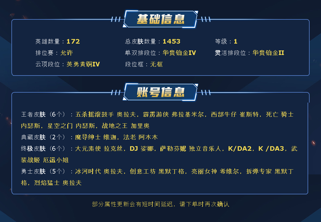 ~~喜欢记得收藏~~可排位~~1329皮全英雄~~租之前尽量查一下游戏ID,确保段位是您需要的,避免浪费您的时间~~请勿挂机逃跑故意送人头,谢谢合作,谢谢~~