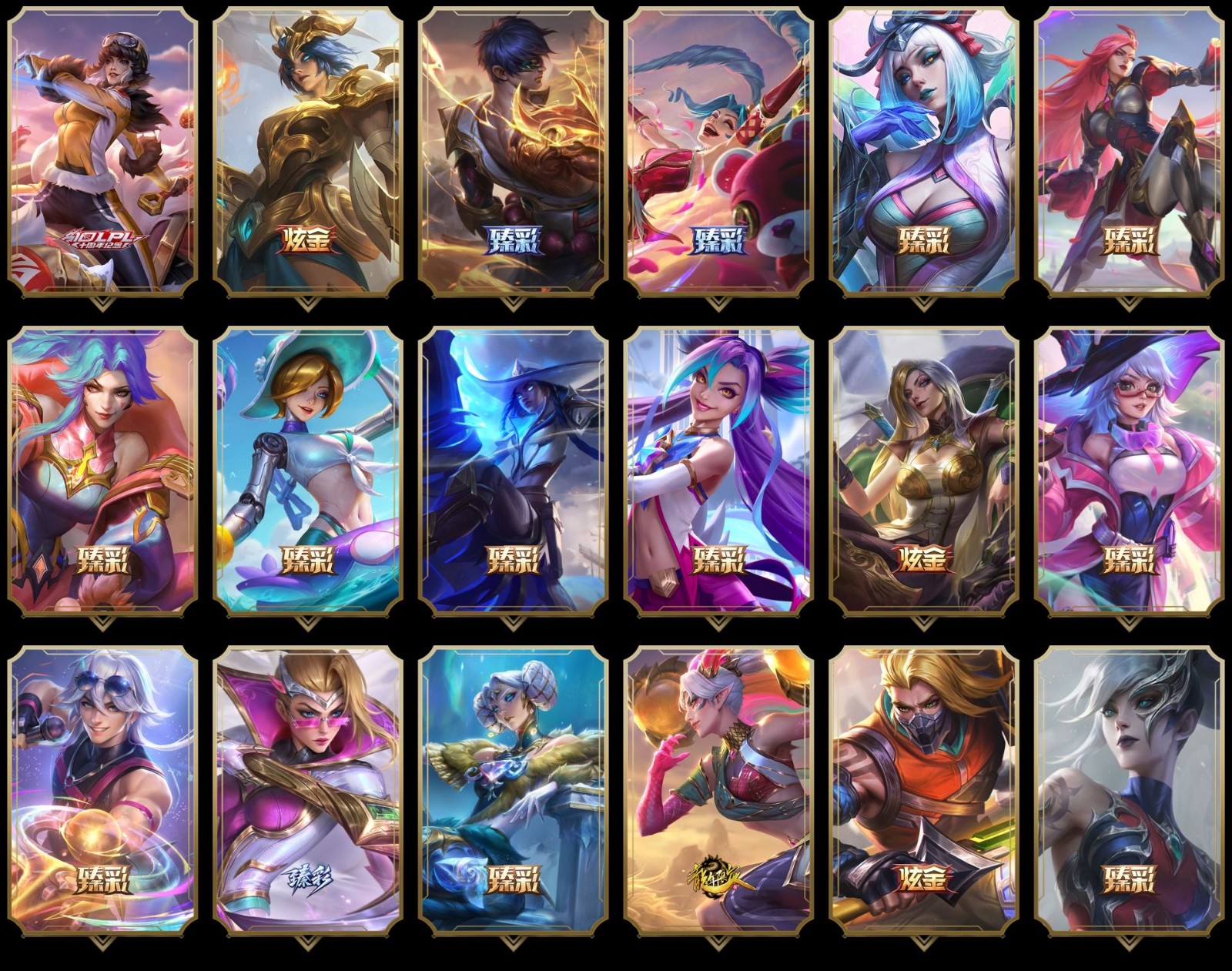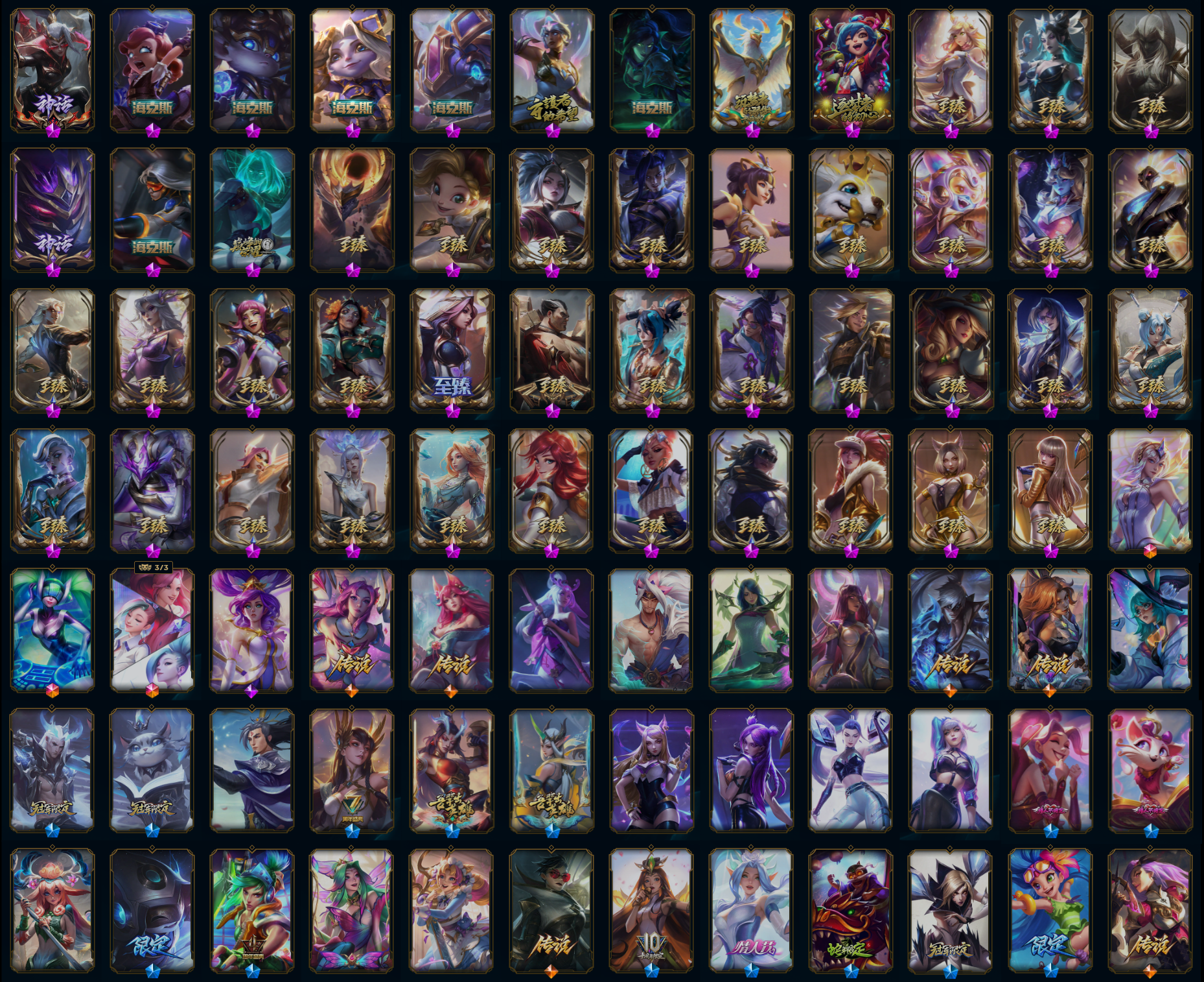 【重要皮肤】莲华温泉厄斐琉斯至臻 凯旋将军德莱厄斯至臻 北极星钢影卡蜜尔至臻 心之钢永恩至臻 魔女阿卡丽至臻 魂蔷薇烈娜塔至臻 玉剑传说琴仙子至臻 斗魂觉醒萨科至臻 墨之影武者亚索至臻 花仙使者卡特琳娜至臻 绝息圣堂厄运小姐至臻 太空律动魔音海妖娜美至臻 灵魂莲华易至臻 海珀利安小队X09星环灵风迦娜至臻 星之守护者辛德拉至臻 海之歌萨勒芬妮至臻 幻灵战斗猫金克丝至臻 青花瓷拉克丝至臻 魅惑女巫莫甘娜至臻 太空律动璐璐至臻 奥术师佐伊至臻 真实伤害赛娜至臻 星之守护者索拉卡至臻 灵能特工伊泽瑞尔至臻 福牛守护者菲奥娜至臻 暗星墨菲特至臻 黑夜使者凯隐至臻 KDA一代卡莎至臻 KDA阿狸至臻 KDA阿卡丽至臻 战斗学院拉克丝至臻 真实伤害奇亚娜至臻 绒毛菲兹至臻 绒毛菲兹2022至臻 腥红之月亚托克斯至臻 腥红之月亚托克斯2022至臻 未来战士锤石至臻 未来战士锤石2022至臻 殿堂传奇薇恩 海克斯科技安妮 海克斯科技克格莫 海克斯科技波比 海克斯科技阿木木 海克斯科技崔丝塔娜 水晶泰坦诺提勒斯 黎明使者卡尔玛 摄魂使者薇恩 新创战纪希维尔 胜利剑圣易 胜利之王泰达米尔 创星之灵璐璐 荣誉使者玛尔扎哈 养蜂人辛吉德 电玩勇者锐雯 玉剑传说舞剑仙 神凰行者幽羽玄凰萨勒芬妮 玉剑传说神机花火 玉剑传说无劫 玉剑传说舞龙卫 玉剑传说星仙子 紫金罗刹莫甘娜 虎痴之拳蔚 神龙之翼库奇 胜利女神瑟庄妮 胜利机器人布里茨 胜利女神奥莉安娜 胜利枪神卢锡安 胜利之剑亚托克斯 水晶玫瑰迦娜 觅心女王艾希 觅心萝莉金克丝 觅心猫猫悠米 水晶玫瑰婕拉 冬境仙灵索拉卡 魄罗骑士瑟庄妮 圣诞糖果棒厄运小姐 魅惑女巫迦娜 魅惑女巫厄运小姐 海之歌永恩 海之歌泽丽 泳池派对佐伊 泳池派对奥莉安娜 泳池派对黑默丁格 泳池派对塔莉垭 泳池派对格雷福斯 泳池派对李青 泳池派对蕾欧娜 泳池派对雷克顿 泳池派对瑟提 制胜金球拉莫斯 EDG佛耶戈 EDG悠米 iG卡莎 SKTT1扎克 SKTT1辛德拉 SKTT1阿利斯塔 SKTT1阿兹尔 SSW图奇 SKTT1劫 暗杀星奥莉安娜 暗杀星蒙多 Fnatic迦娜 Fnatic库奇 Fnatic嘉文四世 Fnatic卡尔萨斯 冰雪节格雷福斯 冰雪节辛吉德 防暴天使凯尔 冠军之矛卡莉丝塔 冠军之隐劫 冠军之志瑞兹 鬼影重重魔腾 海贼瑞兹 红桃杰克崔斯特 胡桃夹子萨科 魅惑女巫娜美 密林猎手提莫 南瓜头费德提克 圣诞精灵崔丝塔娜 圣诞开心鬼提莫 圣诞狂欢基兰 圣诞狂欢努努和威朗普 圣诞老人古拉加斯 圣诞玩偶波比 圣诞驯鹿克格莫 无头骑士赫卡里姆 喜庆之树茂凯 幸福女神乐芙兰 雪装奈德丽 野兽猎人瑟庄妮 勇者阿狸 勇者奈德丽 暗影沃里克 冠军之箭艾希 阿木木主人不要我了 都铎王朝图奇 十周年纪念安妮 源代码乐芙兰 神凰行者瑞羽圣凰艾尼维亚 DJ娑娜 大元素使拉克丝 未来战士伊泽瑞尔 武装战姬厄运小姐 KDAALLOUT萨勒芬妮独立音乐人 KDAALLOUT萨勒芬妮明日新星 KDAALLOUT萨勒芬妮超级巨星 绝息圣堂洛