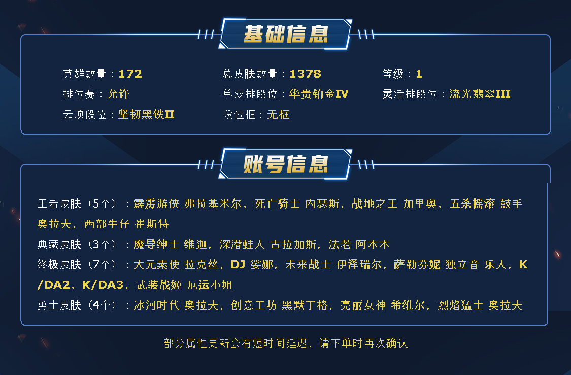 ~~喜欢记得收藏~~可排位~~1296皮全英雄~~租之前尽量查一下游戏ID,确保段位是您需要的,避免浪费您的时间~~请勿挂机逃跑故意送人头,谢谢合作,谢谢~~