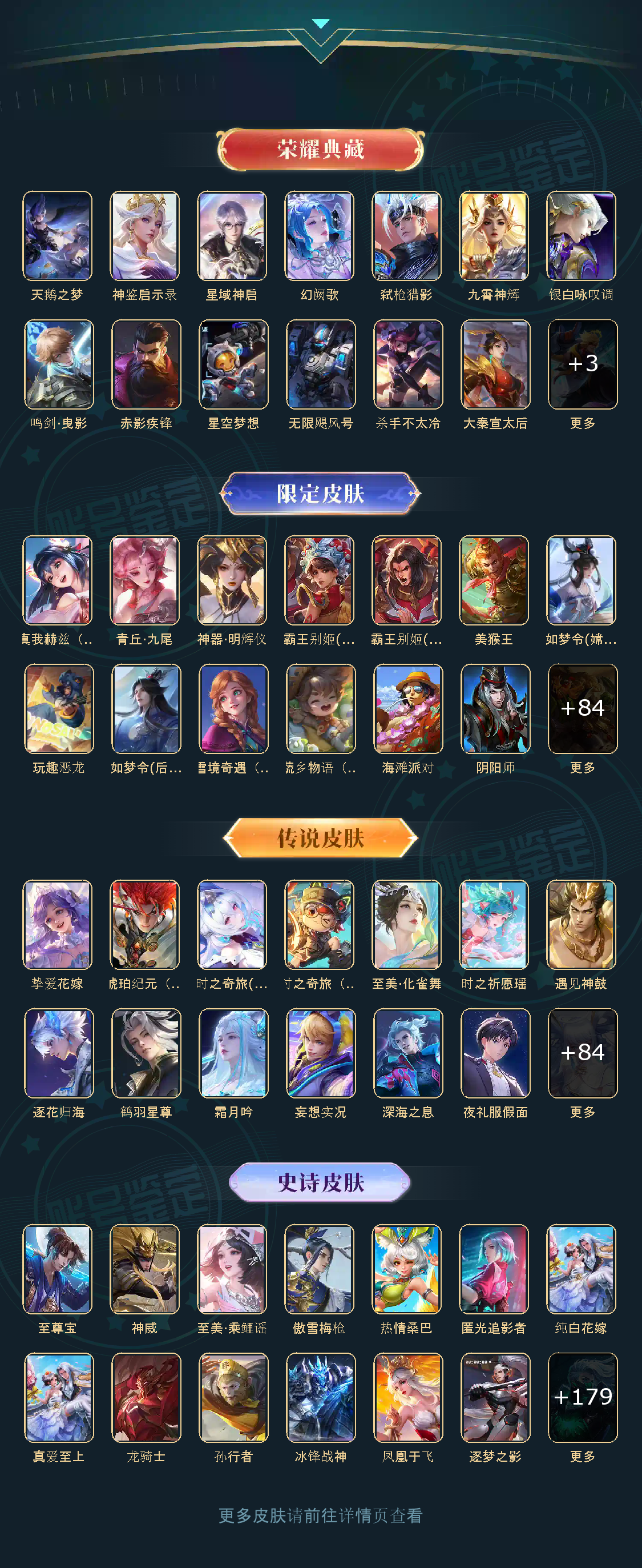 贵族等级V10,段位最强王者,英雄数量128,典藏皮肤数16,皮肤数量608,天鹅之梦/纯白花嫁/天魔缭乱/至尊宝/真爱至上/热情桑巴/星空梦想/无限飓风号/白虎志/匿光追影者/神器·明辉仪/鸣剑·曳影/神鉴启示录/时之奇旅(大乔)/赤影疾锋/真我赫兹(瑶)/时之奇旅(鲁班七号)/无双飞将/至美·化雀舞/时之祈愿瑶/遇见神鼓/默契交锋(兰陵王)/挚爱之约/挚爱花嫁/星域神启/李逍遥/默契交锋(花木兰)/逐花归海/琥珀纪元(马超)/幻阙歌/至美·乘鲤谣/鹤羽星尊/霜月吟/零号·赤焰/妄想实况/深海之息/夜礼服假面/补天/惊梅引/弑枪猎影/异界灵契/神威/炽阳神光/启示之音/影龙天霄/九霄神辉/神树通天/青丘·九尾/鹤归松栖(云缨)/银白咏叹调/傲雪梅枪/天鹅之梦/纯白花嫁/天魔缭乱/至尊宝/真爱至上/热情桑巴/星空梦想/无限飓风号/白虎志/匿光追影者/神器·明辉仪/鸣剑·曳影/神鉴启示录/时之奇旅(大乔)/赤影疾锋/真我赫兹(瑶)/时之奇旅(鲁班七号)/无双飞将/至美·化雀舞/时之祈愿瑶/遇见神鼓/默契交锋(兰陵王)/挚爱之约/挚爱花嫁/星域神启/李逍遥/默契交锋(花木兰)/逐花归海/琥珀纪元(马超)/幻阙歌/至美·乘鲤谣/鹤羽星尊/霜月吟/零号·赤焰/妄想实况/深海之息/夜礼服假面/补天/惊梅引/弑枪猎影/异界灵契/神威/炽阳神光/启示之音/影龙天霄/九霄神辉/神树通天/青丘·九尾/鹤归松栖(云缨)/银白咏叹调/傲雪梅枪