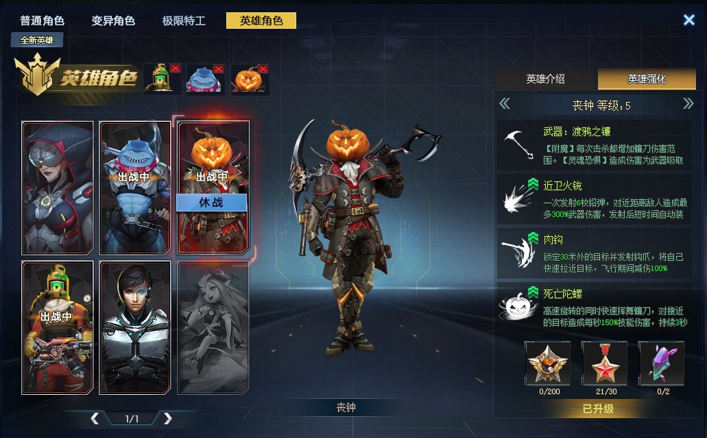 英雄角色:丧钟满级、鲨皇满技能、罐子头满技能