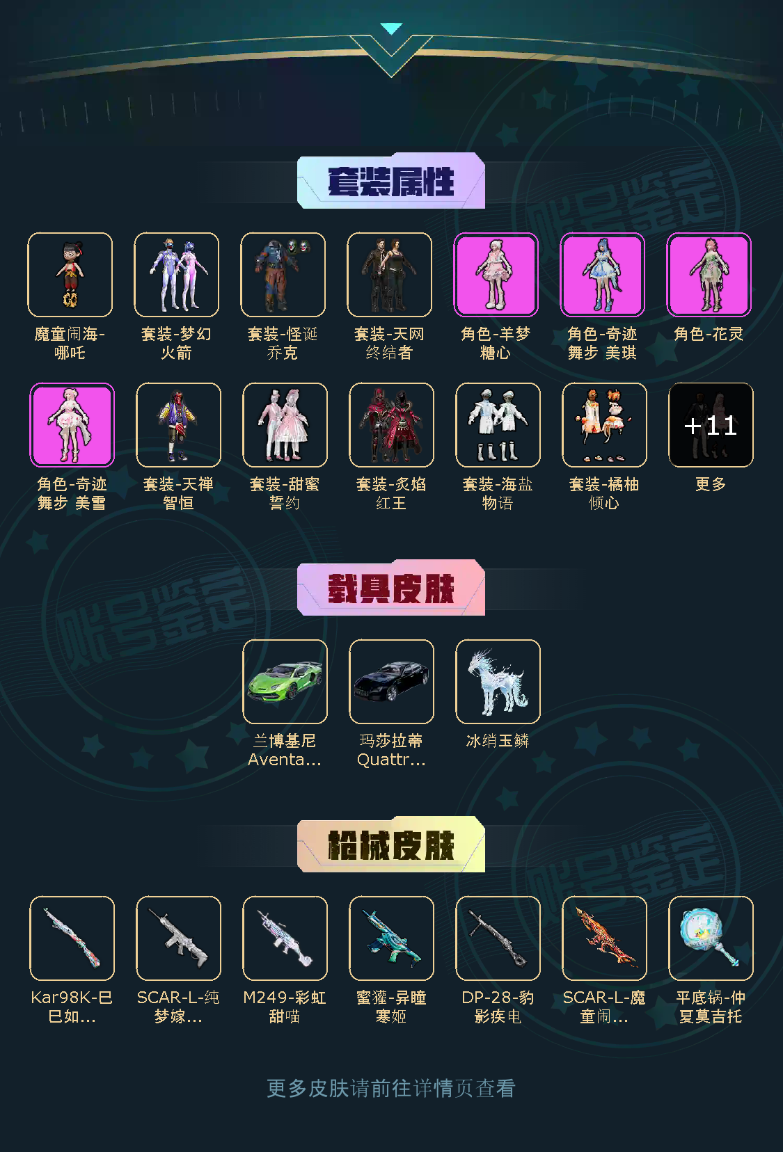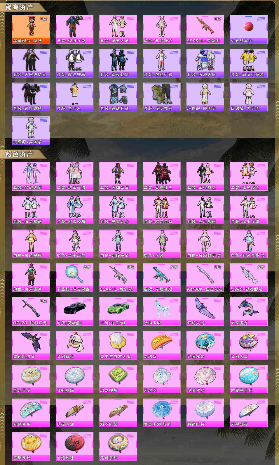 【稀有资产】角色-魔童闹海-哪吒[2级]/套装-怪诞乔克/套装-第五大道/角色-羊梦糖心/SCAR-L-魔童闹海 哪吒/小丑红鼻头/套装-天网终结者/套装-胖达圆圆/套装-暗夜魅影/套装-粉红小猪/套装-浪漫天命/套装-潮萌小黄鸭/套装-暗影哥特/套装-龟仙人/套装-迅捷狂鲨/套装-狂沙舞者/玩偶服-懒羊羊/玩偶服-美羊羊/玩偶服-喜羊羊